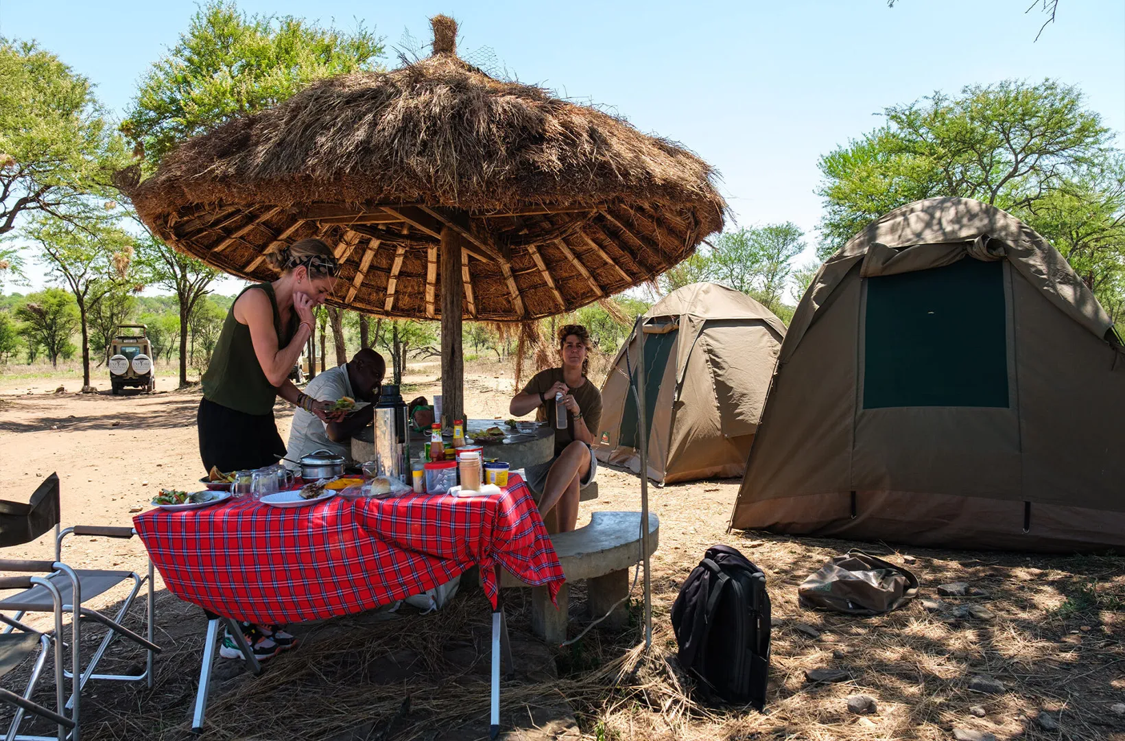 Tarangire is celebrated for its large elephant herds, iconic baobab trees, and diverse landscapes ranging from savannah to seasonal swamps. The Tarangire River sustains wildlife during the dry season, attracting predators and prey alike. Lions may be seen stalking, while giraffes, buffalo, zebras, and wildebeest graze nearby. Birdlife is abundant, with hundreds of species filling the skies. After a full day of game drives, settle into your campsite for dinner and overnight stay.