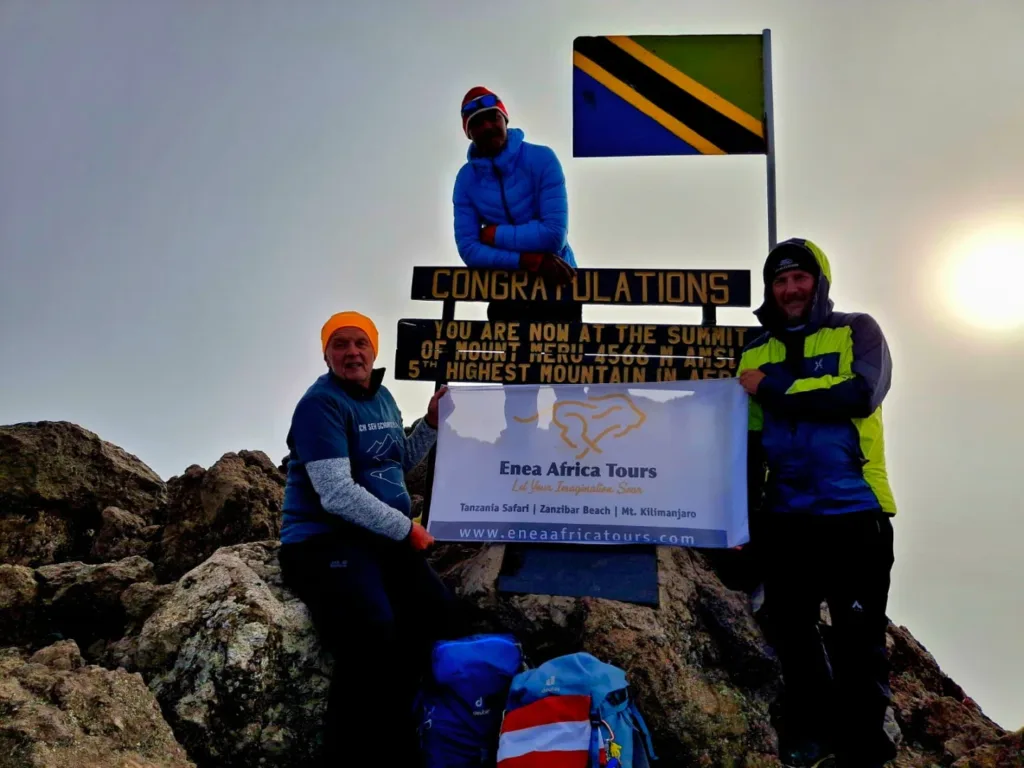Begin your midnight ascent past Rhino Point, reaching Meru Peak (4,562m) at sunrise. Celebrate with breathtaking views before descending to Saddle Hut for brunch, then continue to Momella Gate. Transfer back to Arusha for overnight stay.